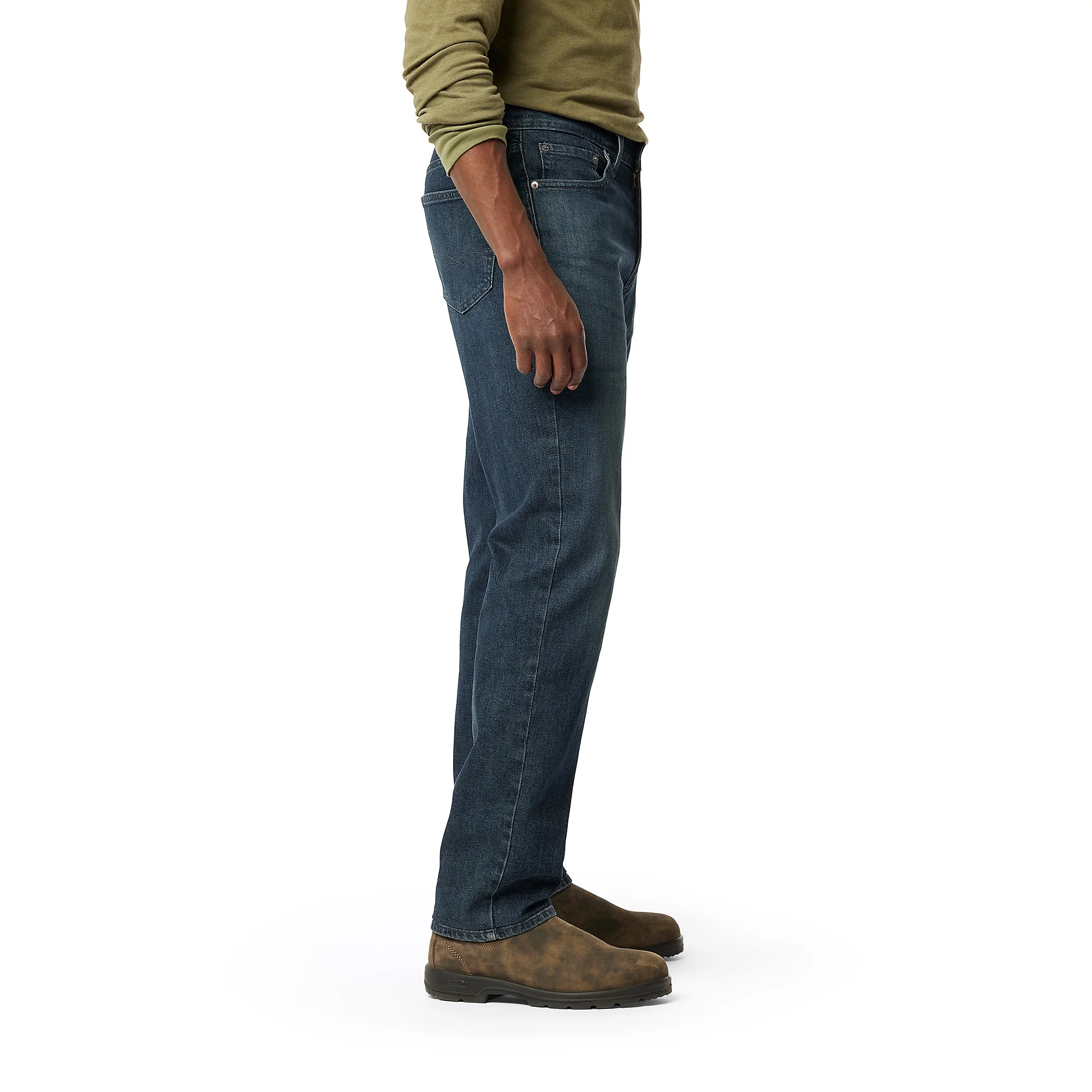 • Fit: Sits at the waist; extra room in the seat and thigh, straight leg; slim leg opening